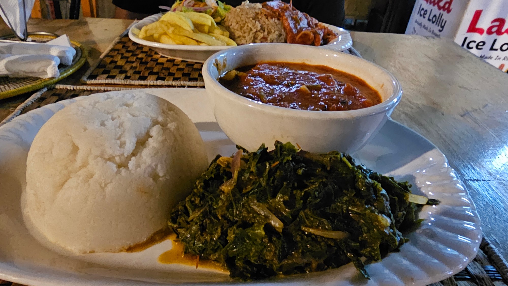 Back in the Central Business District, the car-free zone has a restaurant we really liked called Pan-Afrikan Kitchen. I loved the chicken stew with sukuma wiki (collared greens sauteed together with tomato and onion) and ugali (bread/porridge) for $4.50 USD.