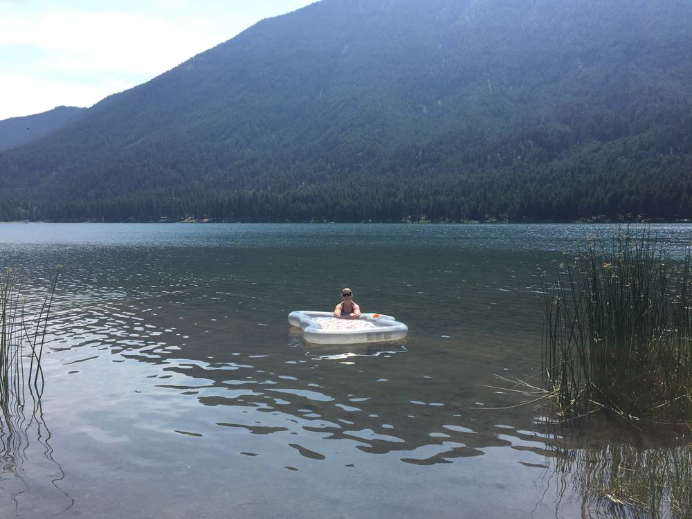 Water floatation: If you're on a lake or other calm body of water, it's nice to have something to float around on. As we're usually in colder waters, our floating mattress keeps us above the water. It also has room for a small, soft cooler that we can fill with beverages and sunscreen. We often also use a long rope tied between us and something sturdy in the lake (like a tree branch) so we don't float too far away from where we want to be.
