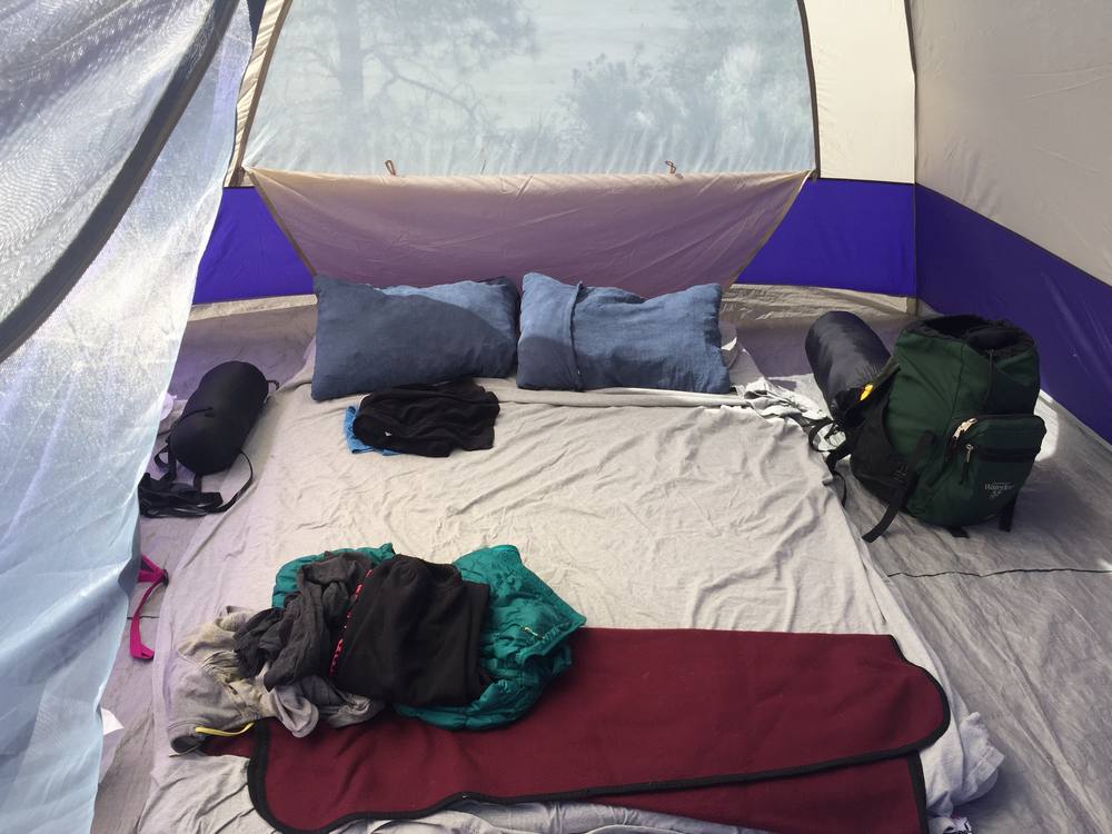 Memory foam mattress: We sleep on a double-wide memory foam mattress topper that we put on top of two single-wide therma-rest mattresses. I'm talking about the 3" thick memory foam mattress you get at Costco that's extremely comfortable. And when we add the therma-rests underneath, we have extra padding and never feel the ground.
