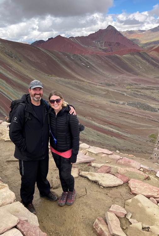 We booked with a tour company for 90 soles per person. We saw an option for 70 soles, but it had terrible reviews, so we paid a bit more to go with a company with better reviews. The price included transportation from Cusco to Rainbow Mountain on roads which are not for those who don't like heights, breakfast, a guide up the mountain, and lunch afterwards. The guide was there for support, but we did the hike at our own pace, with a time to meet the group back at the van a few hours later. The air was really thin up there: Chris did really well, but I had some trouble catching my breath.