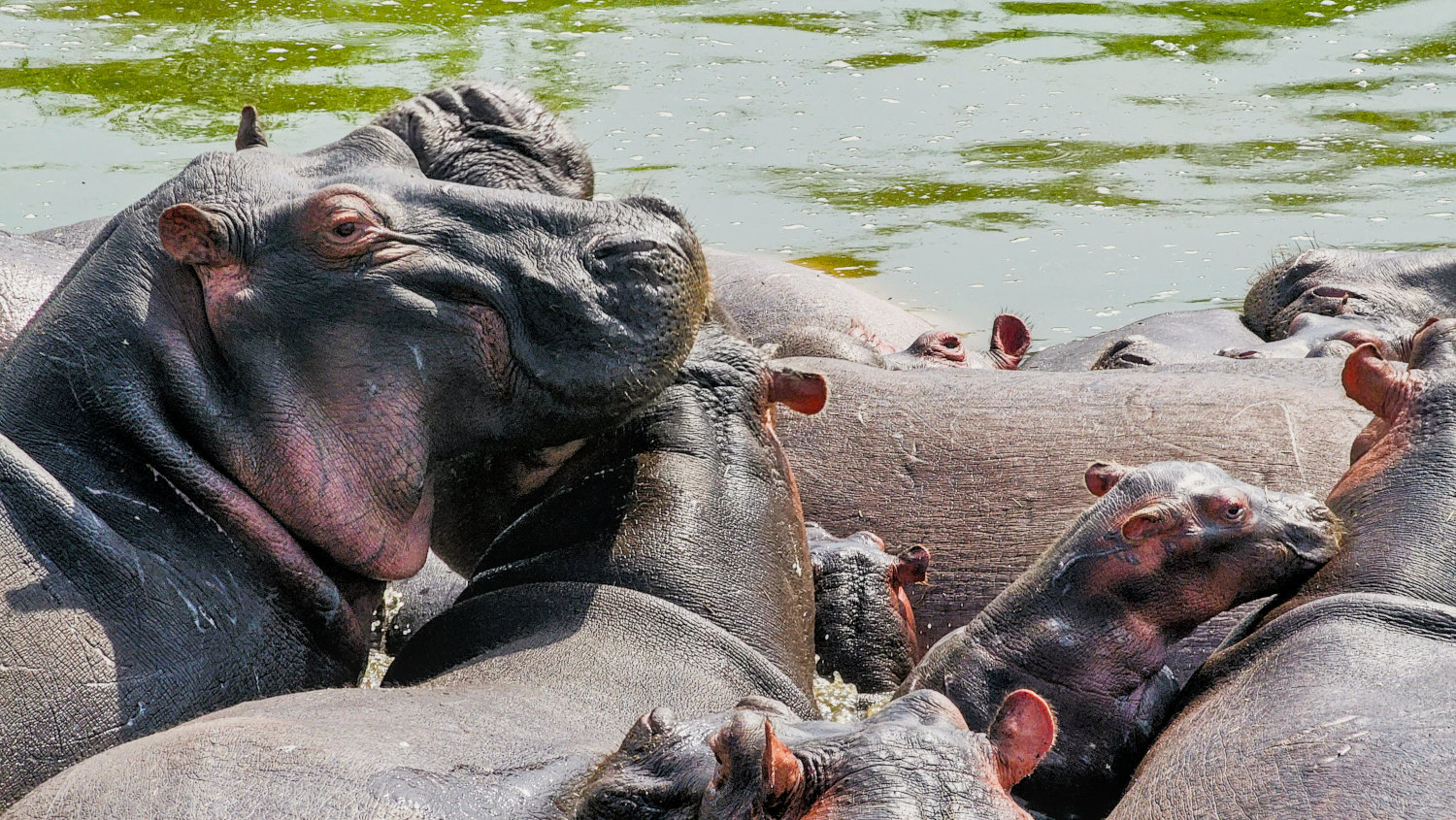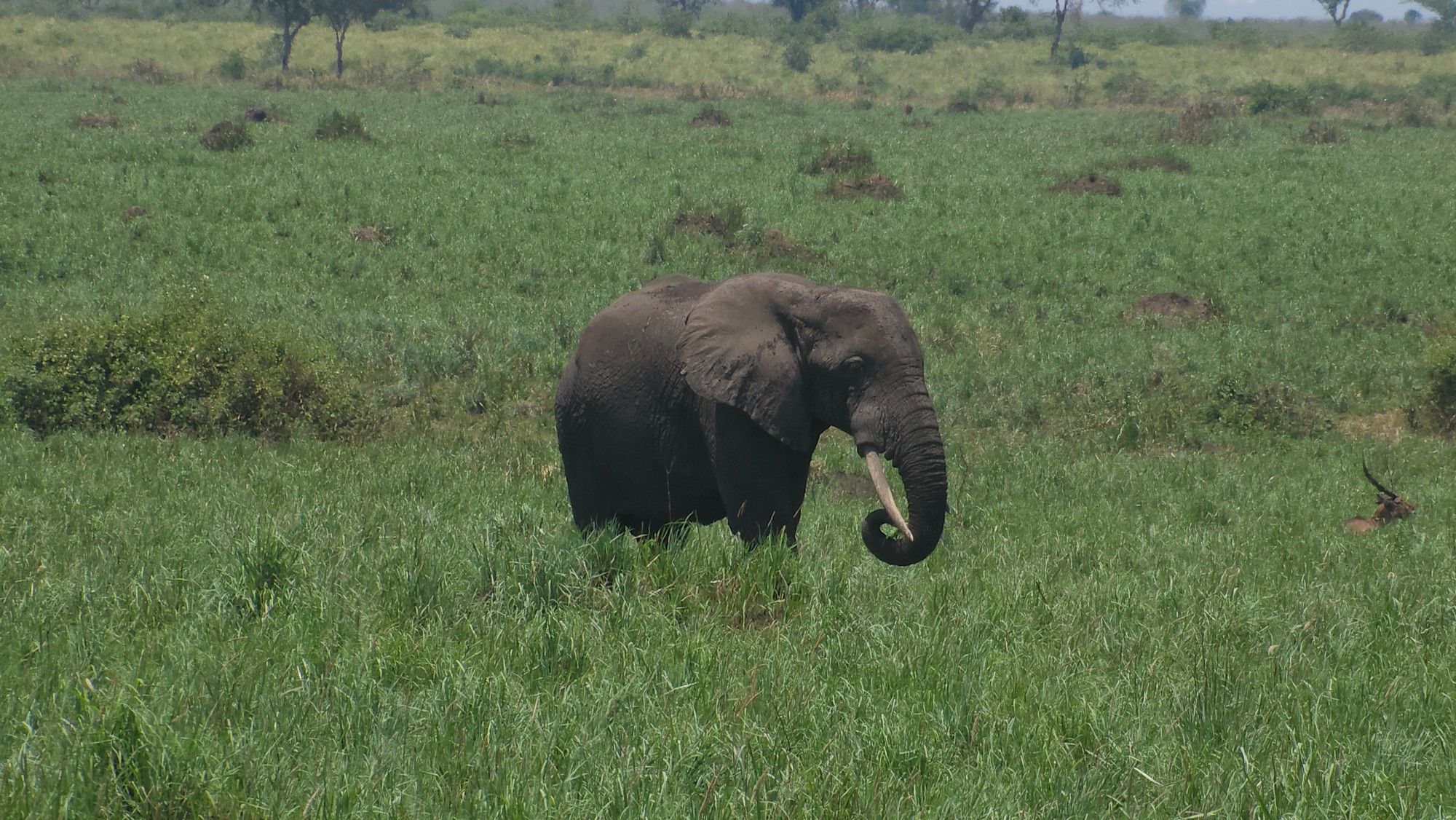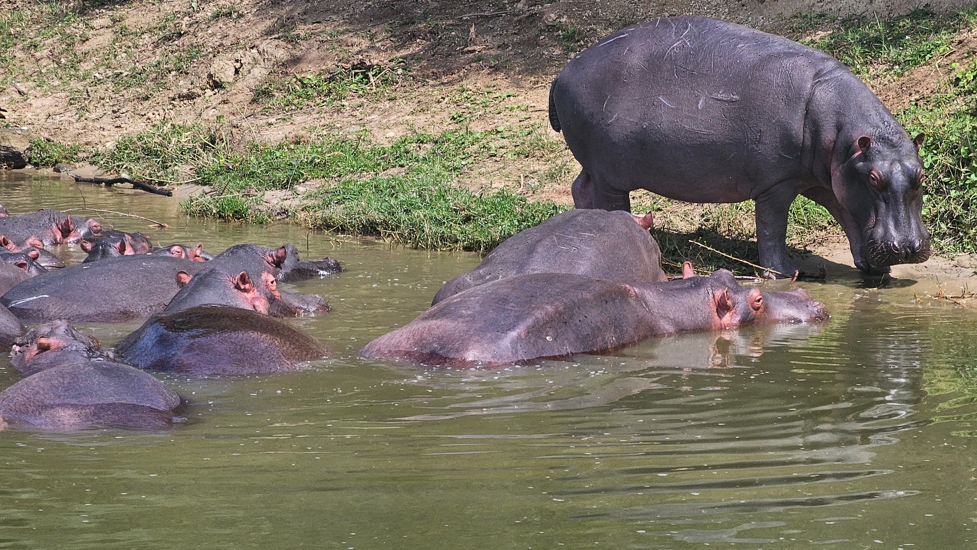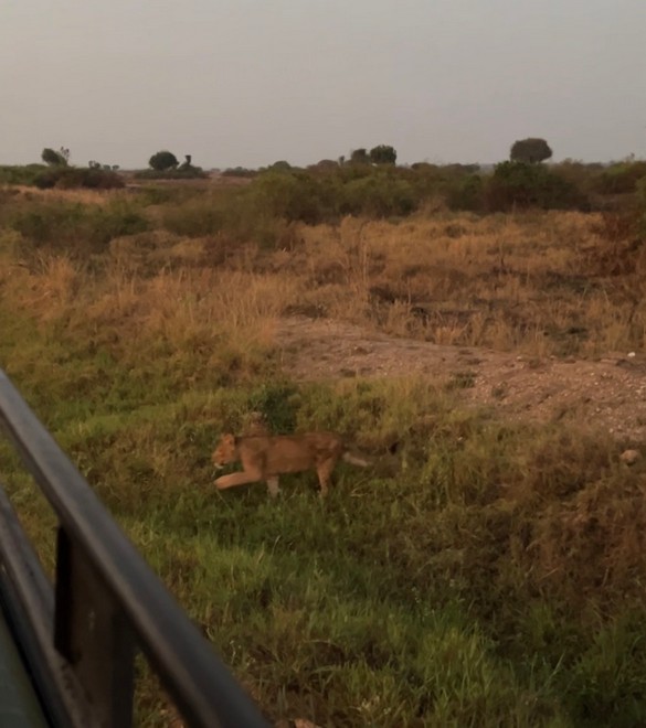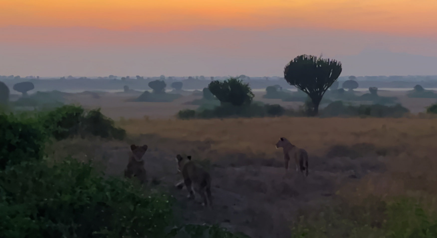 At Queen Elizabeth National Park, the savannah opened up: hippos with egrets perched on their backs, buffalo grazing in the distance, and an elephant walking toward us with ears flapping. A pride of nine lions crossed directly in front of our vehicle, disappearing into the tall grass. At night, hippos and elephants wandered through camp, reminding us how wild this place is.